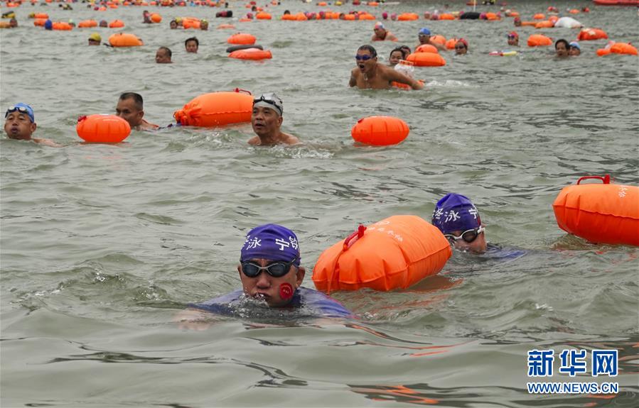 2019年1月1日,冬泳爱好者在广西南宁横渡邕江。当日是新年第一天,冬泳爱好者在水中畅游,迎接新年的到来。新华社发(刘峥 摄)