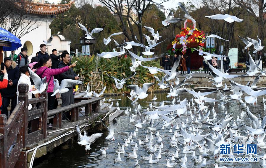 1月1日,市民和游客在大观公园里观赏红嘴鸥。 新华社记者 蔺以光 摄