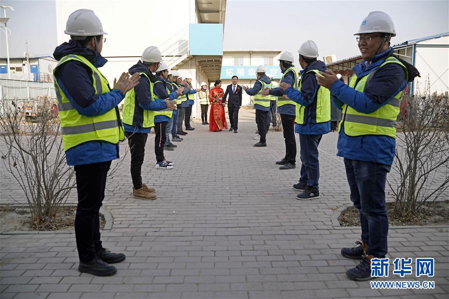 1月1日,在中建三局三公司北京大兴国际机场项目部,项目副经理杨明超与新婚妻子许建伟在集体婚礼上接受工友们的祝贺。当日,中建三局三公司北京大兴国际机场项目部为四对员工举办了一场朴素而温馨的工地新年集体婚礼。新华社记者 才扬 摄