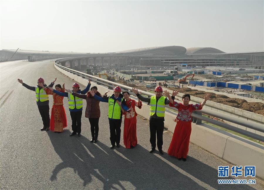 1月1日,在北京大兴国际机场航站楼前,新人们合影留念(无人机拍摄)。当日,中建三局三公司北京大兴国际机场项目部为四对员工举办了一场朴素而温馨的工地新年集体婚礼。新华社记者 才扬 摄