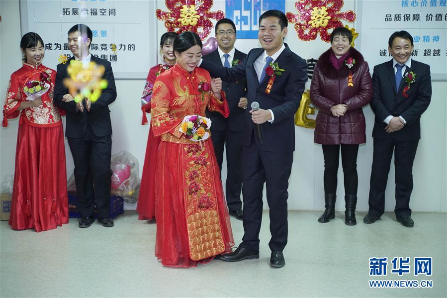 1月1日,在中建三局三公司北京大兴国际机场项目部,项目副经理杨明超与新婚妻子许建伟在婚礼上。当日,中建三局三公司北京大兴国际机场项目部为四对员工举办了一场朴素而温馨的工地新年集体婚礼。新华社记者 才扬 摄