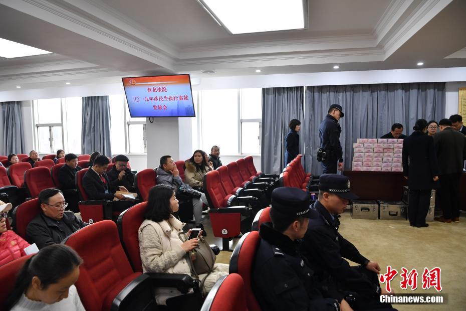 1月2日,发还大会现场。当日,云南省昆明市盘龙区人民法院举行涉民生案件案款集中发放大会,向53件执行案件申请人发放3969万元(人民币)执行款,其中现金发放500万元(人民币)。中新社记者 刘冉阳 摄
