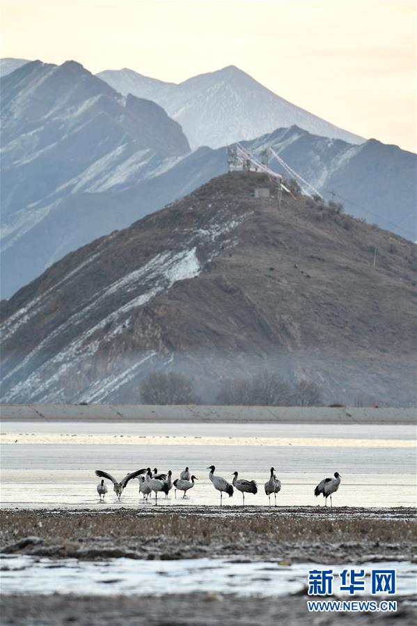 栖息在拉萨市林周县卡孜水库边的黑颈鹤(1月1日摄)。 冬季,由于适宜的环境和充足的食物,拉萨市林周县和达孜区等地成了越来越多黑颈鹤聚集的家园。 新华社记者 张汝锋 摄