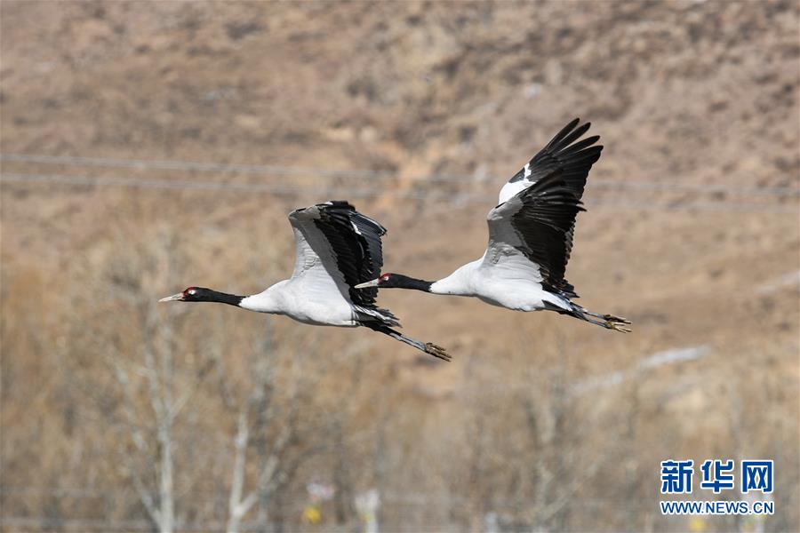两只正在拉萨市达孜区田野上空飞翔的黑颈鹤(1月1日摄)。 冬季,由于适宜的环境和充足的食物,拉萨市林周县和达孜区等地成了越来越多黑颈鹤聚集的家园。 新华社记者 张汝锋 摄