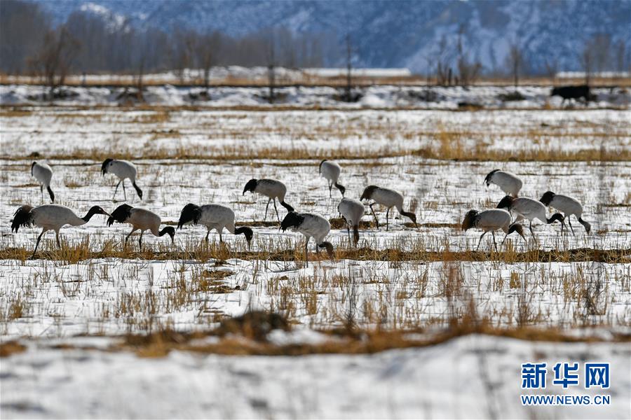 一群正在拉萨市达孜区农田里觅食的黑颈鹤(1月1日摄)。 冬季,由于适宜的环境和充足的食物,拉萨市林周县和达孜区等地成了越来越多黑颈鹤聚集的家园。 新华社记者 张汝锋 摄