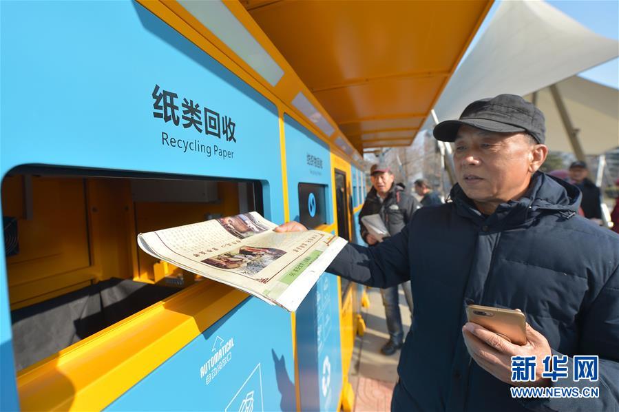 1月2日,青岛同德路社区居民在使用人工智能垃圾分类机。 当日,山东青岛合肥路街道的人工智能垃圾分类终端机投入使用。居民可通过手机app、微信扫码等方式使用该设备,分类回收金属、塑料、纺织物、纸类、玻璃等多种生活垃圾,助力社区环保。 新华社发(王海滨 摄)
