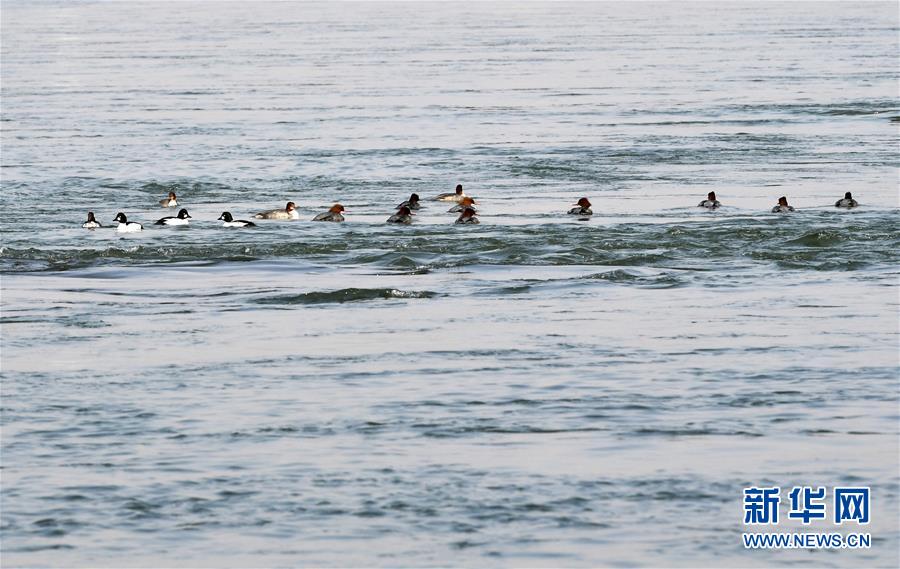 1月2日,在黄河兰州段,一群水鸟在水中戏水觅食。 隆冬时节,随着黄河上游生态环境的不断改善,越来越多的水鸟来到甘肃省兰州市的黄河段越冬。 新华社记者 范培珅 摄
