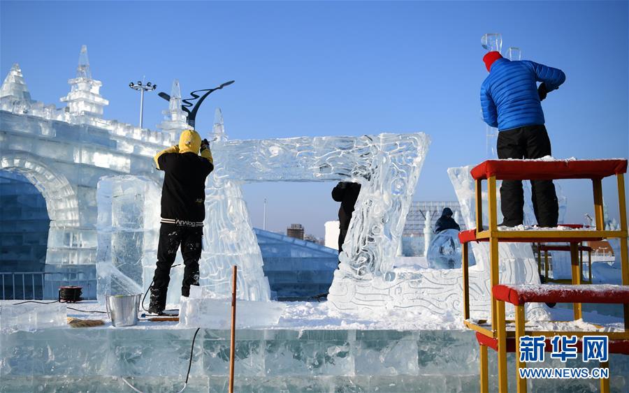 1月2日,选手在哈尔滨冰雪大世界内制作冰雕。 新华社记者 王建威摄
