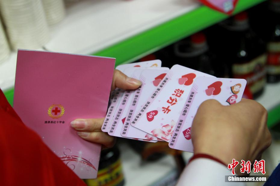 1月3日,青海省首家爱心超市的工作人员展示兑换商品所需要的积分卡。据了解,该超市位于青海省西宁市湟源县境内,超市内的商品都来自社会捐赠,湟源县下辖各乡镇的贫困户可以通过劳动兑换积分,再用积分兑换各自所需的商品。中新社记者 李培源 摄