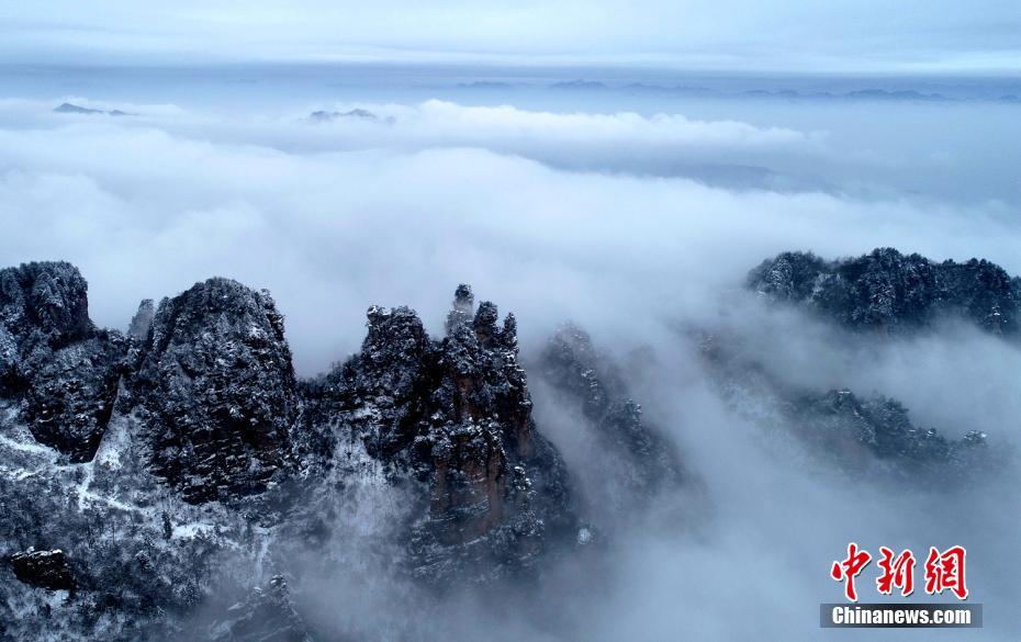 1月3日,旅游胜地湖南张家界武陵源天子山、黄石寨、袁家界等景区出现壮观的云海景观,银装素裹的峰林间云雾缭绕,宛若仙境。吴勇兵 摄
