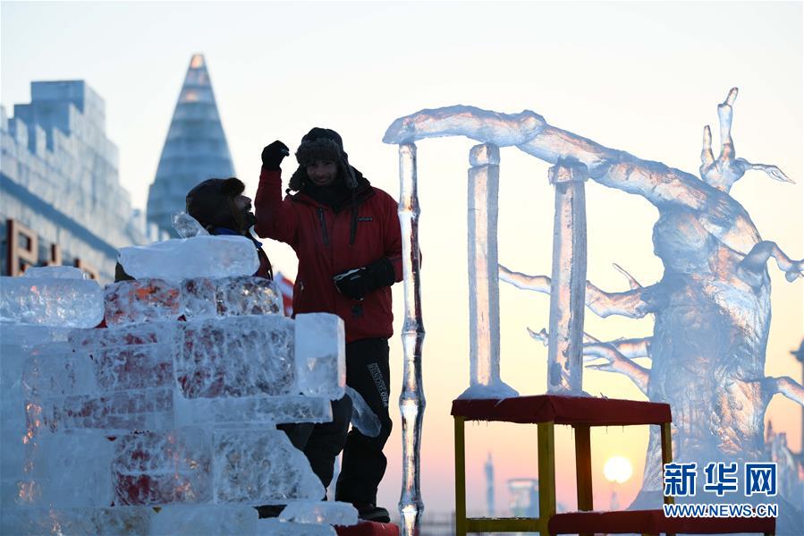 1月3日,参赛选手在夕阳下进行冰雕创作。 新华社记者 王建威 摄