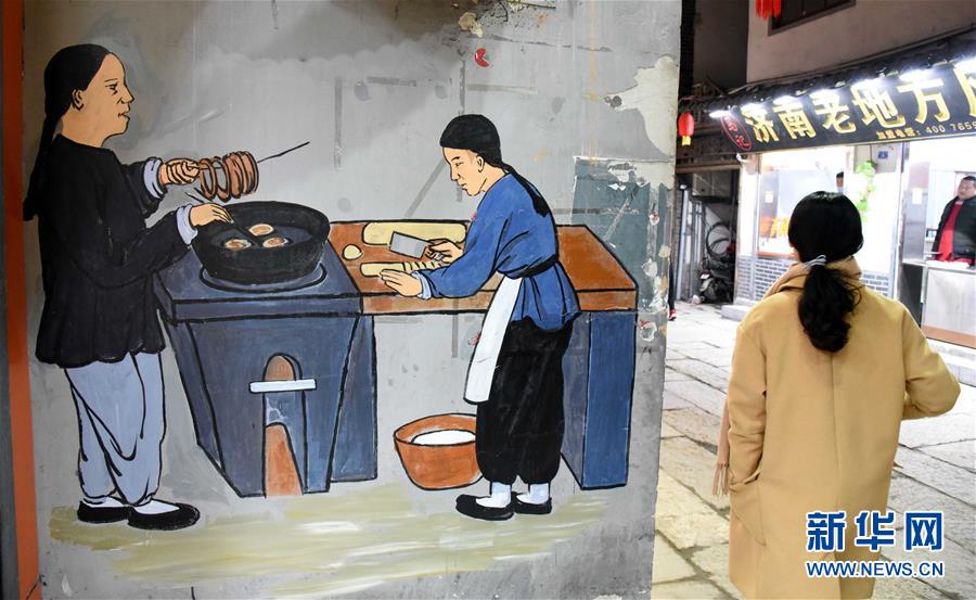 1月3日,游客走过芙蓉街上一处画有传统济南市井生活的院墙。 位于济南老城区的芙蓉街有四百年的历史,是济南的一张旅游“名片”。近日,历经近两个月的封闭改造,焕然一新的芙蓉街重新对游客开放。芙蓉街改造工程重点对地下的管网、管线进行重新铺设,还对新泉、古水道、老石板路面进行保护。 新华社记者王凯摄