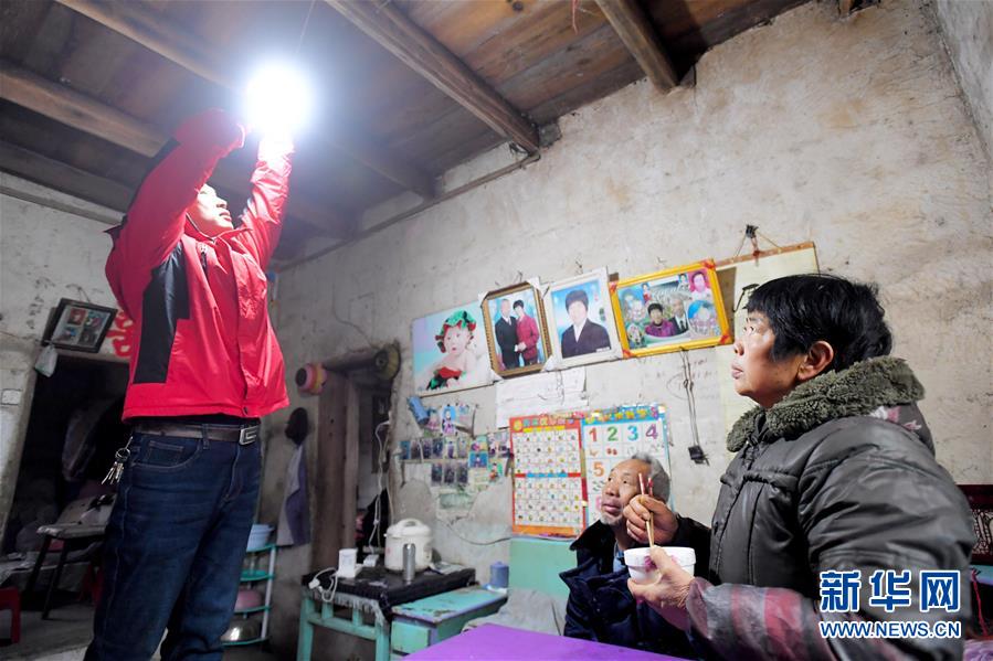 1月3日,志愿者在石马山镇小冲村村民梁菊英(右一)家中为其更换灯泡。 当日,湖南省涟源市爱心志愿者联合石马山镇卫生院医护人员来到石马山镇小冲村的贫困户家中,为他们送上过冬物资、开展“爱心义诊”,让他们感受到冬天里的温暖。 新华社发(陈泽国摄)