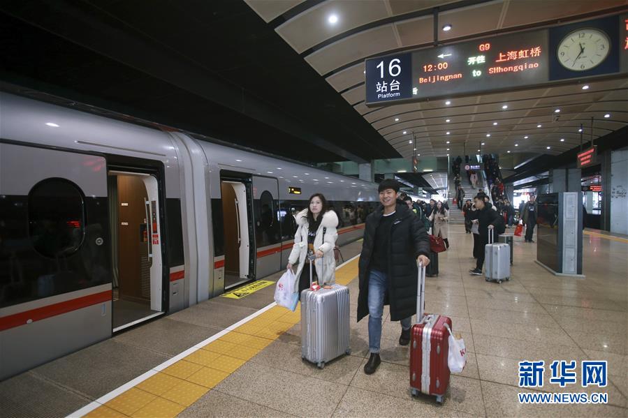 1月5日,旅客登上即将从北京南站首发的超长版时速350公里“复兴号”G9次动车组。 新华社发(陈晓根 摄)