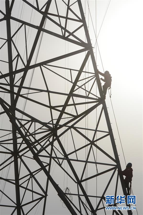 1月5日,电力工作人员登塔准备进行紧线作业。 当日,莎车-喀什750千伏线路工程I标段放线工作全部完成,标志着南疆750千伏延伸补强工程全线贯通。该工程作为新疆750千伏主网架的组成部分,将提高南北疆电网互供、疆电外送能力,改善新疆缺电、少电地区群众的生产生活。 新华社发(丁磊 摄)