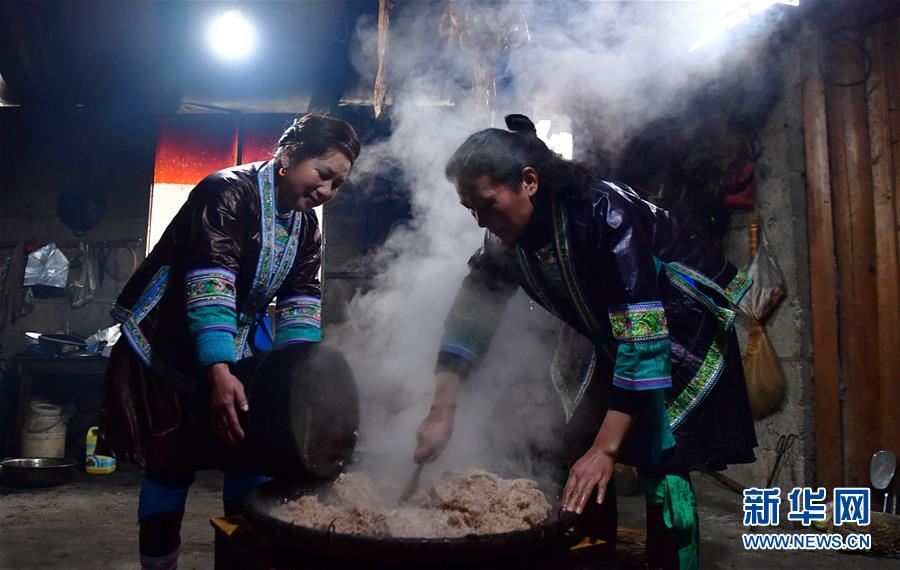 1月5日,在广西融水苗族自治县杆洞乡尧告村,村民在制作糯米饭。新华社记者 黄孝邦 摄
