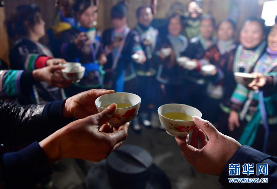1月5日,在广西融水苗族自治县杆洞乡尧告村,村民们在聚会中喝“吉祥酒”。“吉祥酒”是苗族群众最喜欢的传统饮料,是苗族人为重大节日准备的。 新华社记者 黄孝邦 摄
