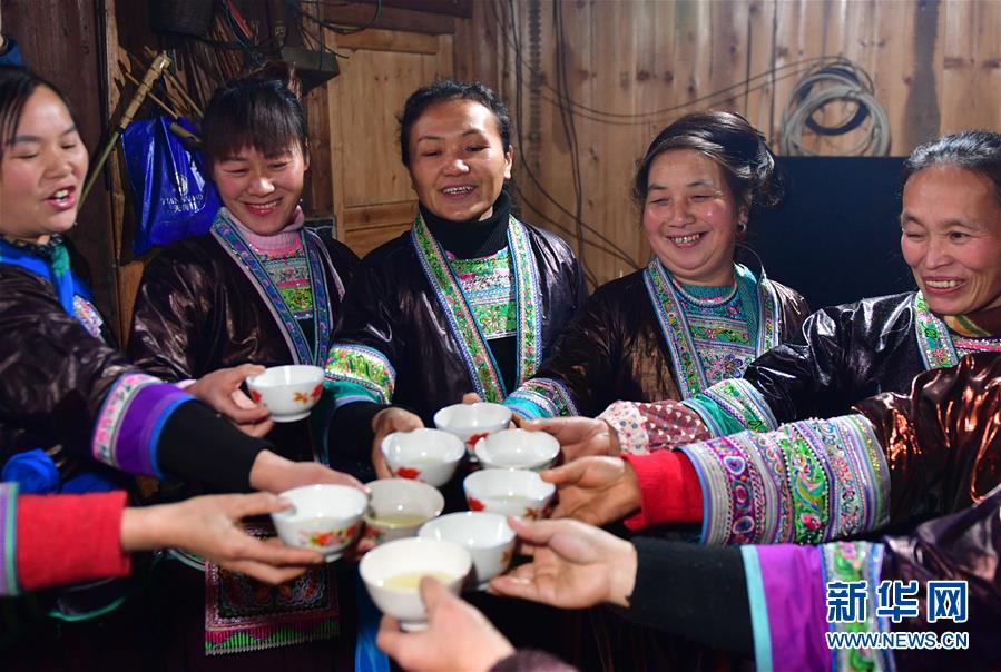 1月5日,在广西融水苗族自治县杆洞乡尧告村,村民们在聚会中喝“吉祥酒”。“吉祥酒”是苗族群众最喜欢的传统饮料,是苗族人为重大节日准备的。新华社记者 黄孝邦 摄