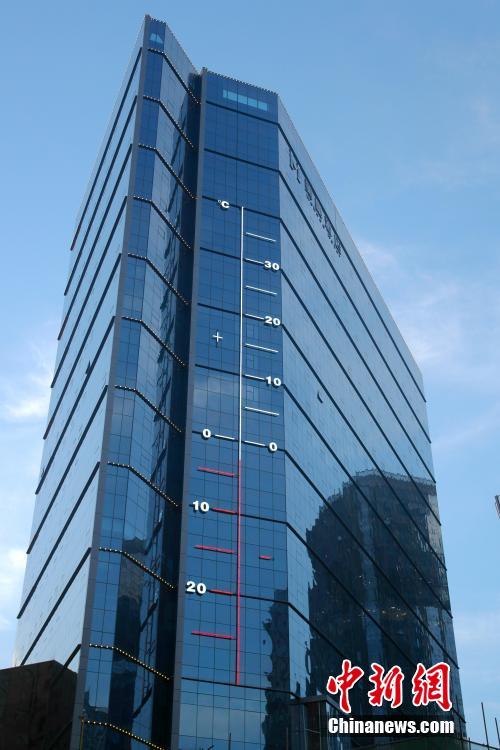 1月6日,西宁市海湖新区,位于一座大厦外部的巨型温度计格外引人注目。据了解,该温度计高达53米,利用户外温感技术实时记录室外温度。 中新社记者 李培源 摄