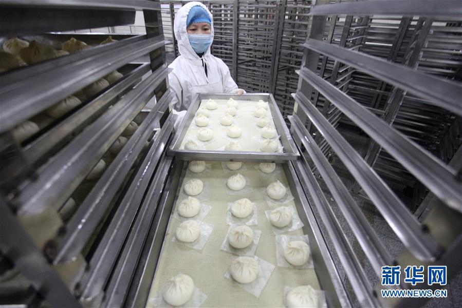 1月7日,在江苏扬州市汤汪乡一家包子生产企业,工人在生产车间摆放包子。 春节将至,扬州特产“扬州包子”迎来销售旺季,当地包子生产企业一派繁忙。 新华社发(孟德龙 摄)