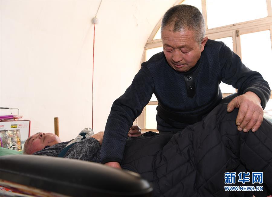 1月7日,高顺华为父亲翻身。 1958年出生的高顺华家住陕西省榆林市靖边县张家畔镇。其父高玉柱2007年不慎跌倒,导致瘫痪在床,生活不能自理,高顺华毫不犹豫地承担起照顾父亲的责任。 如今,85岁的高玉柱在儿子的精心照料下,面色红润,精神十足。高顺华坚持不懈照顾父亲在当地传为佳话,同村人无不称赞。 新华社记者 张博文 摄