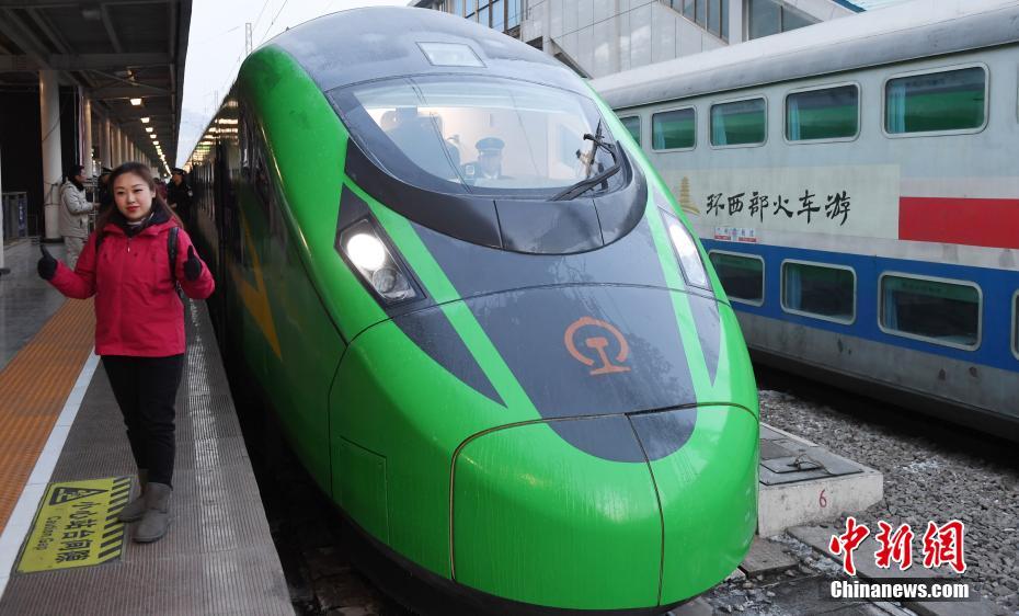 1月8日,由兰州开往重庆北的D754次“复兴号”动车组列车8时55分自兰州站启程,标志着时速160公里动力集中“复兴号”动车组列车正式开跑兰渝线。兰州至重庆的旅行时间由原来的最短10小时51分压缩至6小时59分。途经甘陕川渝三省一市的兰(兰州)渝(重庆)铁路,于2017年9月29日全线通车运营,是中国第三条连通南北的铁路大动脉。中新社记者 杨艳敏 摄