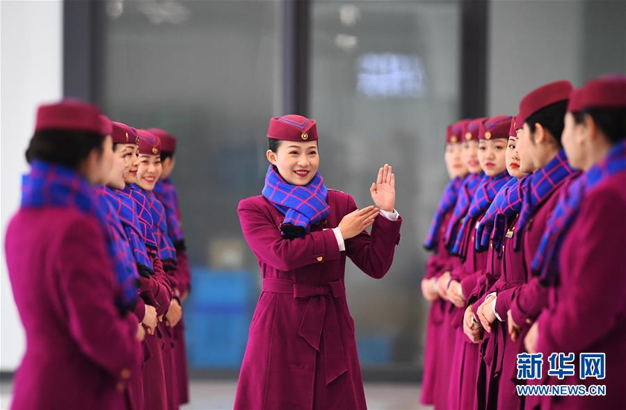 1月8日,乘务人员在进行礼仪培训。 2019年春运临近,中国铁路成都局集团有限公司重庆客运段组织动车组乘务人员进行基础业务、妆容礼仪等方面的集中培训,提升服务水平。 新华社记者 王全超 摄