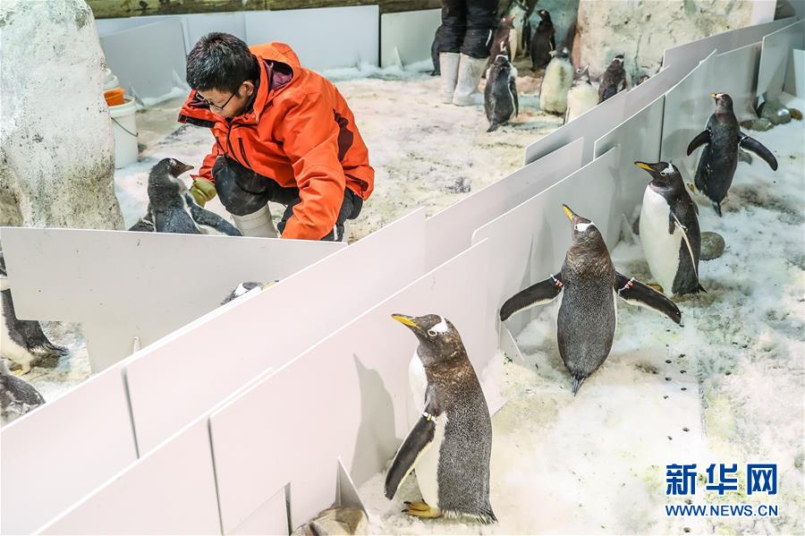 1月9日,驯养员给白眉企鹅宝宝喂食,成年白眉企鹅在隔离板外关注自己的宝宝。 辽宁大连圣亚海洋世界有一个专门帮助企鹅宝宝学习成长的特殊“幼儿园”,白眉企鹅宝宝要在这里学会独立吃鱼、游泳等技能后才可以“毕业”。 自然界中,企鹅成长到一定年龄就会和父母分开,独立生活。为了模拟企鹅自然繁育的生长环境及规律,大连圣亚海洋世界每年都会将适龄企鹅集中到企鹅“幼儿园”,与父母分离,学习独立生存技能。 据介绍,现阶段企鹅宝宝们和父母还处于初步隔离阶段,只有一“墙”之隔,等到适应期一过,它们要离开企鹅们生活的圣亚南极企鹅岛,进行专门的封闭学习。在“幼儿园”度过三个月左右的时间以后,小企鹅就可以“毕业”重新回到企鹅岛,与成年企鹅一同生活。 新华社记者 潘昱龙 摄