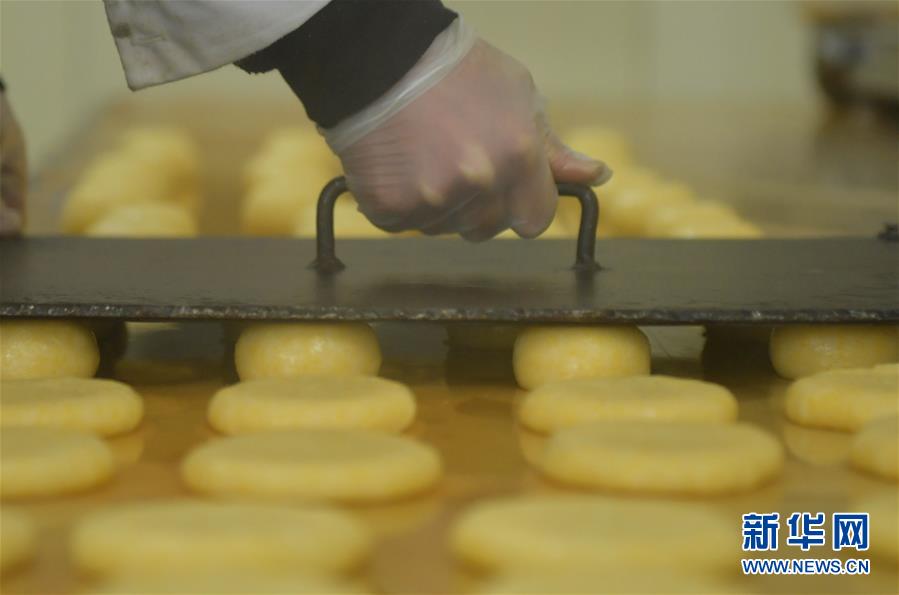 1月9日,在湖北省恩施土家族苗族自治州宣恩县万寨乡伍家台村,工人用铁片将揉成小团的原料压成糍粑。