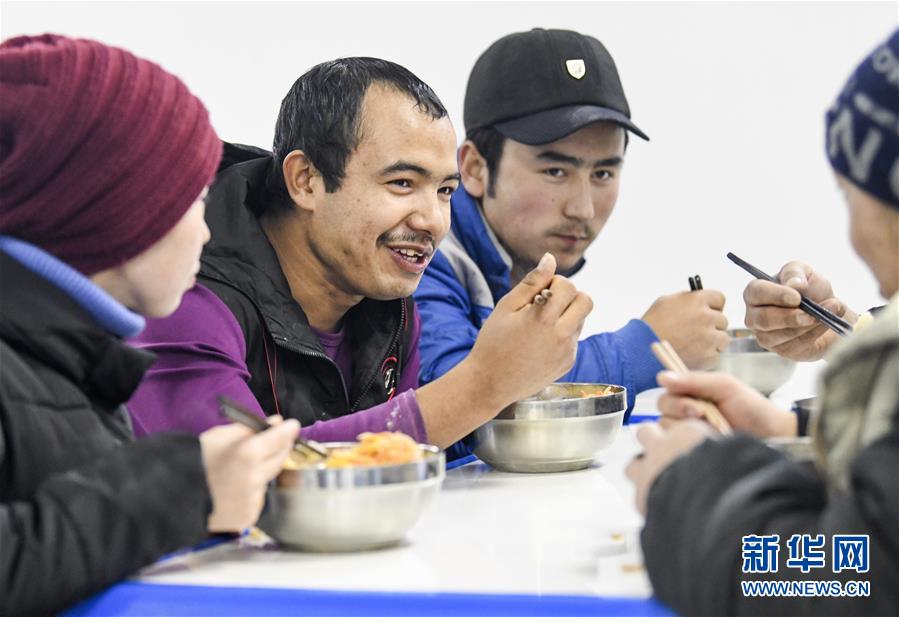 阿卜都(左二)在食堂和同事一起吃饭(1月8日摄)。新华社记者 王菲 摄