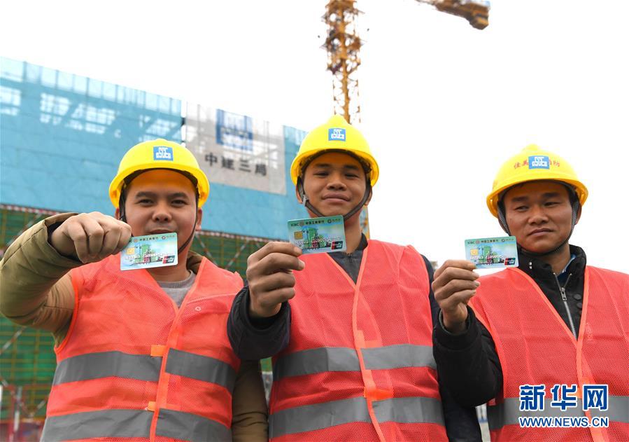 1月10日,在广西柳州市柳东新区中建三局一公司南宁公司启元广场项目建设工地,农民工展示自己刚刚办理的专属工资卡。