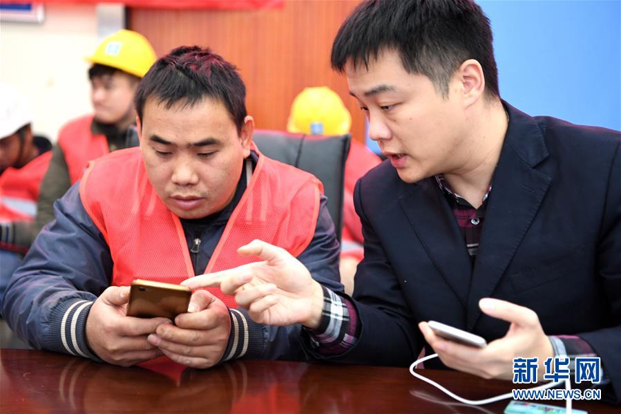 1月10日,银行工作人员在广西柳州市柳东新区中建三局一公司南宁公司启元广场项目部帮助农民工将专属工资卡绑定广西建筑农民工实名制管理公共服务平台客户端。 新华社记者 周华 摄