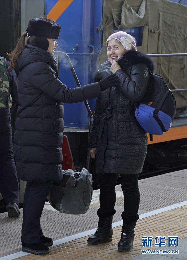 1月11日,在满洲里火车站站台,“金钥匙”服务台客运员协助外籍旅客乘车。