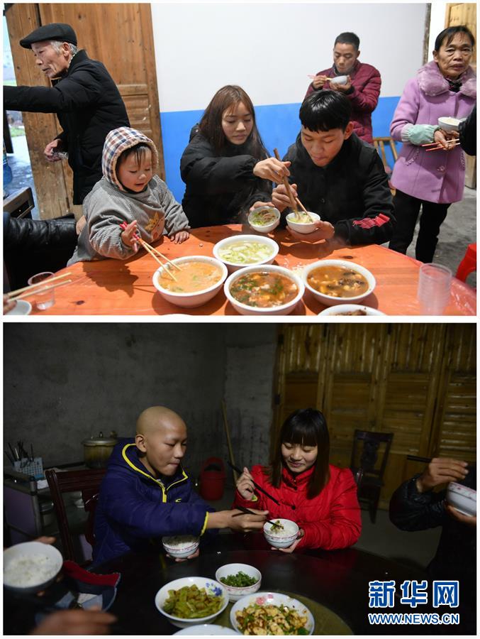 这是一张拼版照片,上图:黄林(中)给弟弟黄好夹菜(1月10日摄);下图:弟弟黄好在给黄林夹菜(2015年11月25日摄)。 新华社记者 周密摄