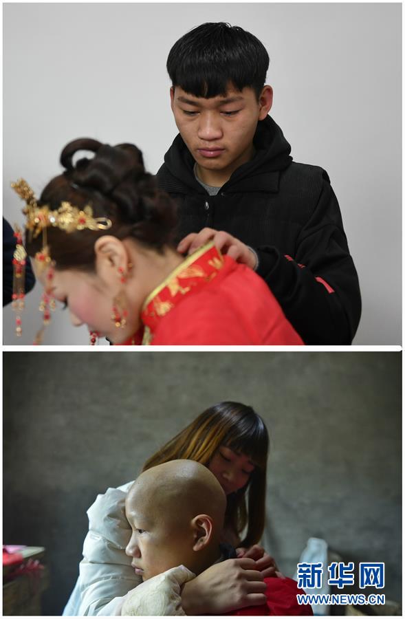 这是一张拼版照片,上图:黄好为姐姐黄林整理衣服,准备送她出门(1月11日摄);下图:黄林帮弟弟黄好整理衣服。因为化疗,黄好的头发和眉毛都掉光了(2015年11月25日摄)。新华社记者 周密摄