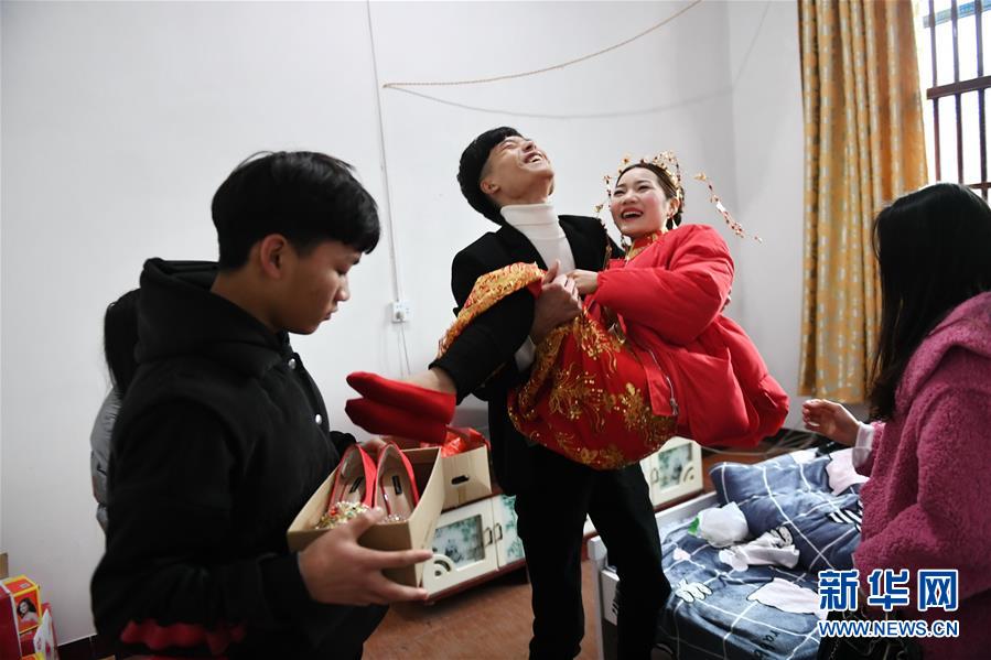 新郎抱起黄林出门(1月11日摄)。 新华社记者 周密摄
