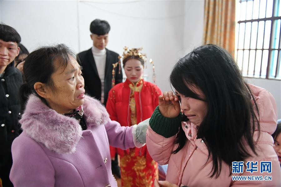 姐姐黄雪英(右)和大姨陈兰真(左)送别新娘黄林(1月11日摄)。 新华社记者 周密摄