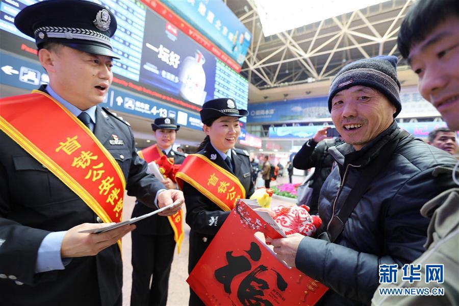 1月11日,民警在北京西站向旅客发放宣传材料。