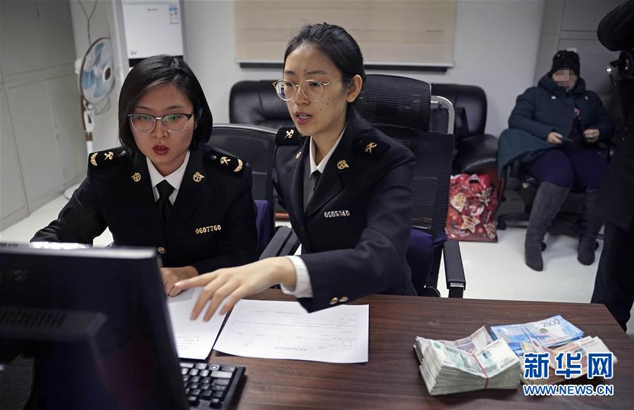 1月10日,在满洲里公路口岸,海关工作人员查获一起超量携带外币入境,正在做相关情况的登记工作。