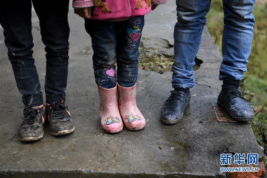 1月10日拍摄的师生三人的鞋上全部沾满泥巴,从村里到教学点,他们只能踩着泥泞的山路上下学。