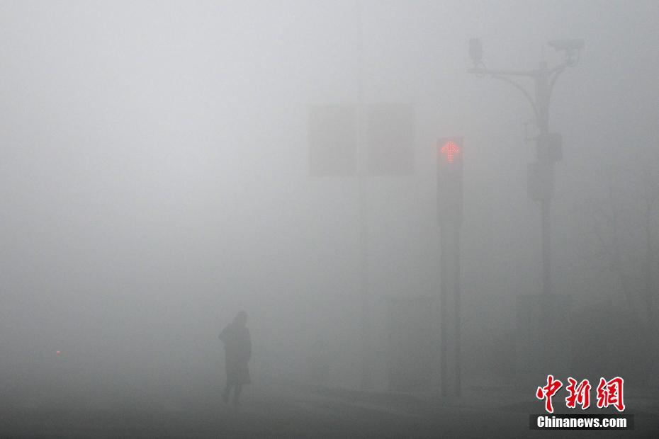 1月12日,行人在大雾笼罩的街头行走。天津市气象台当日8时11分将当地大雾黄色预警信号升级为橙色,预计天津大部分地区上午将出现能见度小于200米的浓雾。中新社记者 佟郁 摄