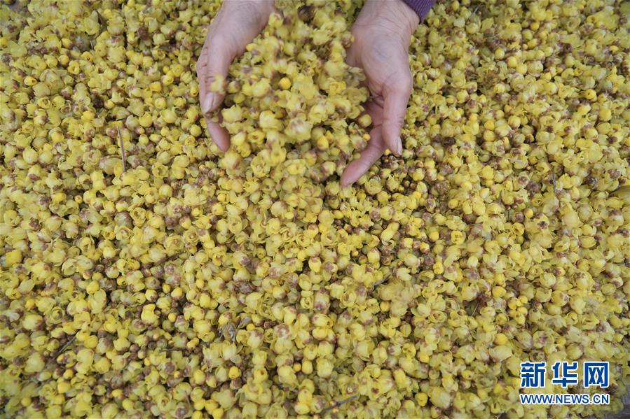 1月12日,在重庆市北碚区静观镇,花农筛选蜡梅花以备酿造使用。新华社发(秦廷富 摄)