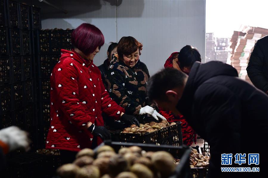 在河南省鲁山县瓦屋镇土桥村,村民们在冷库内整理香菇(1月13日摄)。 近年来,位于伏牛山区的河南省鲁山县瓦屋镇土桥村利用气候资源优势,大力发展香菇种植,成为村民脱贫致富的重要抓手。 新华社记者 冯大鹏 摄