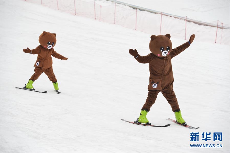 1月15日,滑雪教练身穿卡通服在保康县过渡湾镇梅花寨云海滑雪场表演。