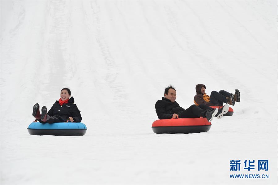 1月15日,游客在保康县过渡湾镇梅花寨云海滑雪场体验滑雪圈。新华社发(杨韬 摄)