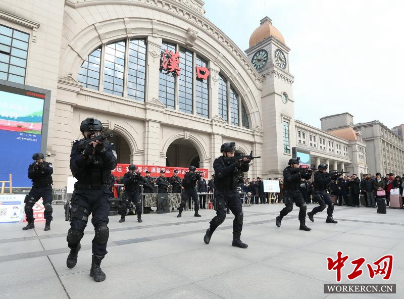 当日,武汉铁路特警在武汉市汉口火车站宣誓维护良好的铁路运输秩序,确保旅客走得了、走得好。