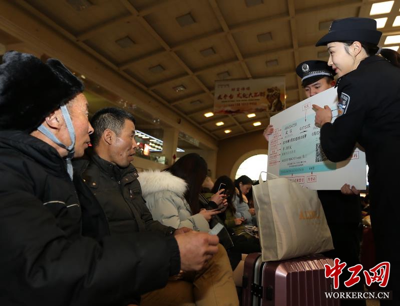 当日,武汉铁路民警在武汉市汉口火车站教旅客识别假火车票。