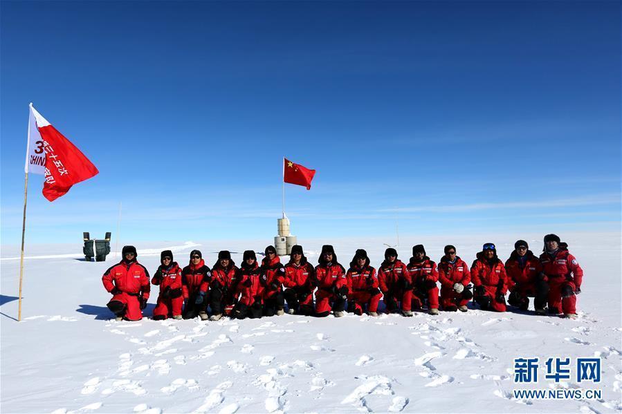 当日,中国第35次南极科考队昆仑队队员来到海拔4093米的南极冰盖最高点冰穹A,在南极冰盖之巅换上了一面崭新的国旗。新华社记者 刘诗平 摄 图片来源:新华网