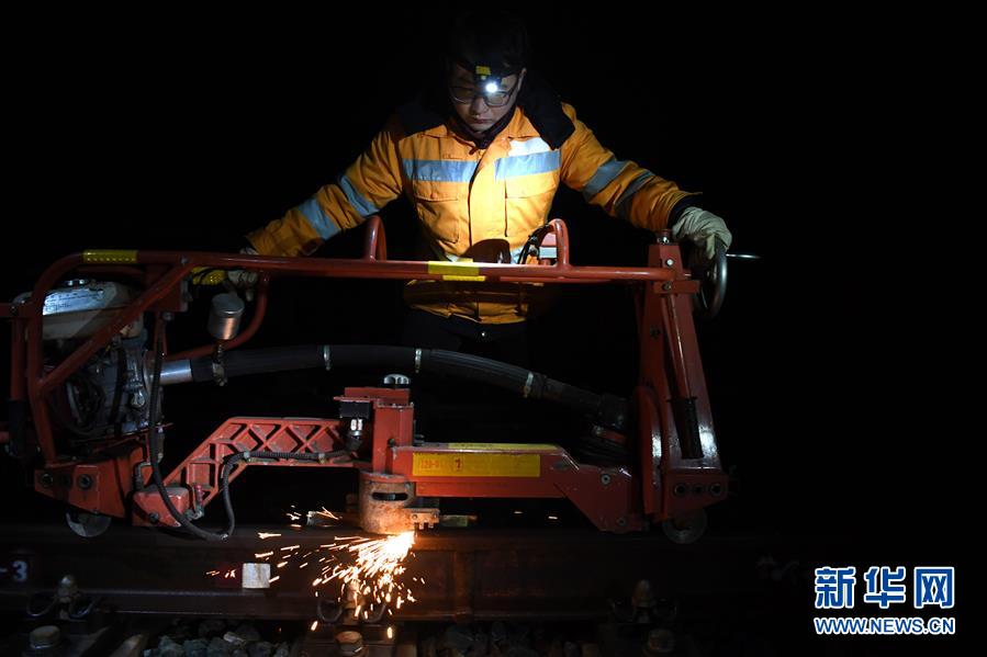 1月17日,绩溪北综合维修工区高铁线路工在打磨钢轨。新华社记者刘军喜摄