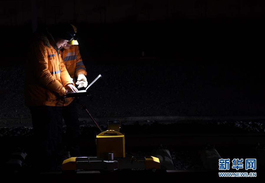 1月17日,绩溪北综合维修工区高铁线路工在测量道岔数据。新华社记者刘军喜摄